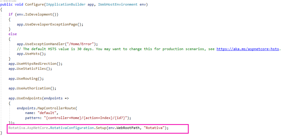 Nuestro siguiente paso para comenzar con la implementación de nuestro generador será dirigirnos a la clase Startup.cs en la cual añadiremos únicamente el código señalado en el recuadro como se muestra en la siguiente imagen: