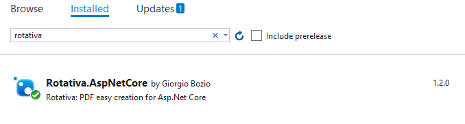 Para realizarlo será necesaria la instalación del Nuget Rotativa.AspNetCore que instalaremos desde Visual Studio